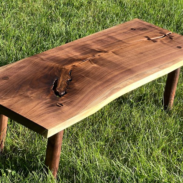 A simple yet elegant table named after my Son. The one featured is crafted from beautiful eastern black walnut, locally sourced. Simple sturdy hand turned legs, and butterfly keys to stabilize the split in the wood. This table was designed so simply in order to be made in any dimensions necessary for your home. Also available in Oak or Maple. The legs are fitted to tenons on the tables surface and a wooden wedge is added to ensure strength and durability to last a lifetime!
